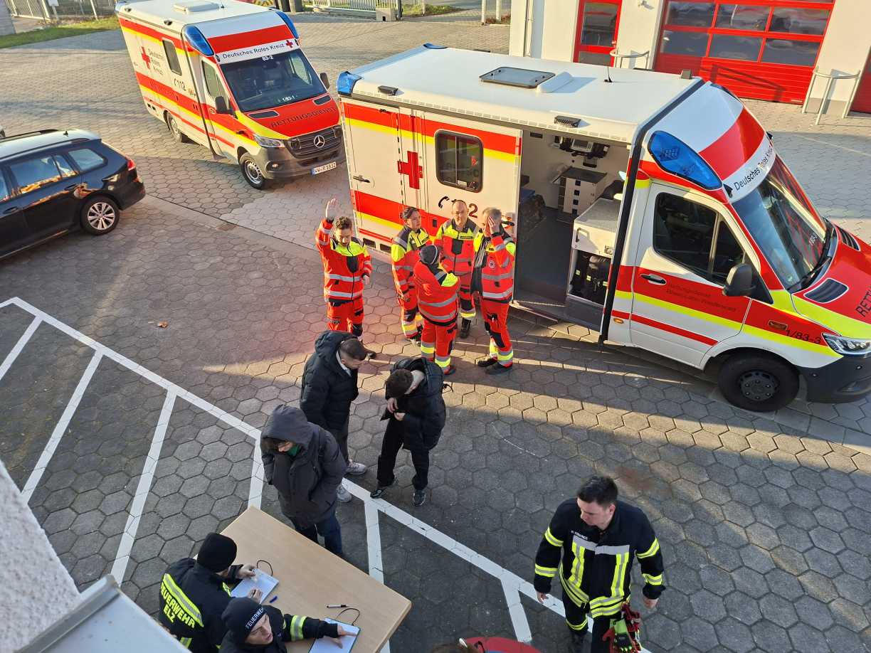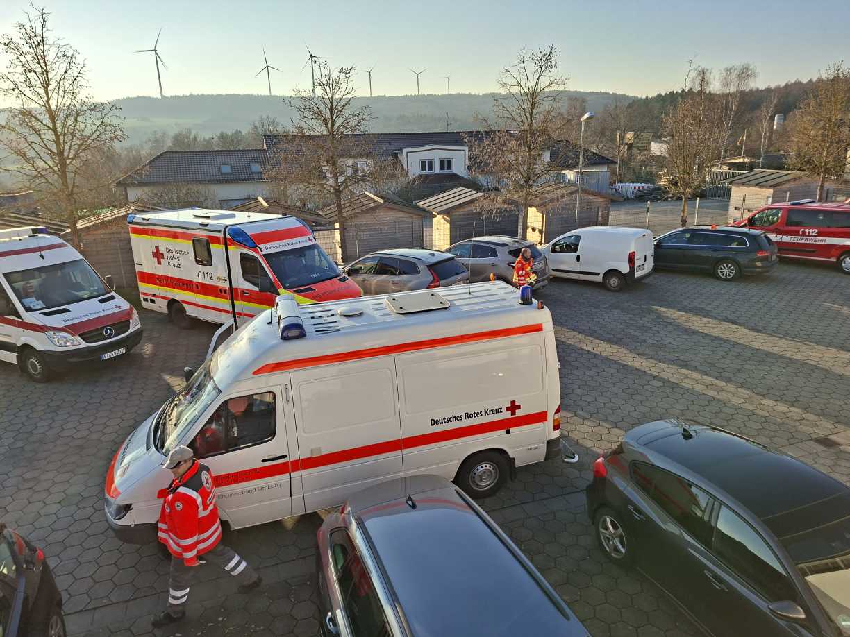 Zahlreiche Rettungsfahrzeuge des Deutschen Roten Kreuzes -auch aus den benachbarten Landkreisen-, sowie Mannschaftstransportfahrzeuge von Feuerwehren und THW sorgten für den Personentransfer von der Autobahn nach Elz.