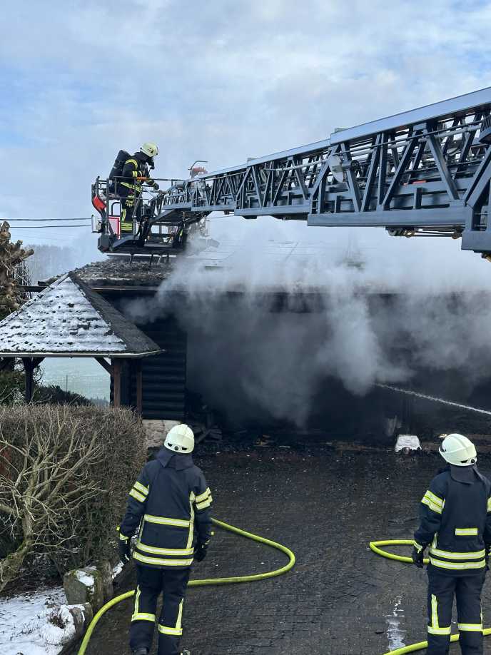 Beim Eintreffen der örtlichen Feuerwehr hatte sich das Feuer bereits zu einem Vollbrand entwickelt. Winterliche Straßenverhältnisse erschwerten den Einsatzfahrzeugen zudem die Zufahrt zum Brandobjekt, das in einem Hang lag.