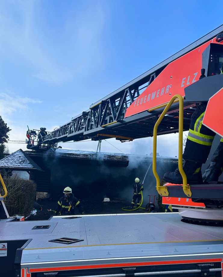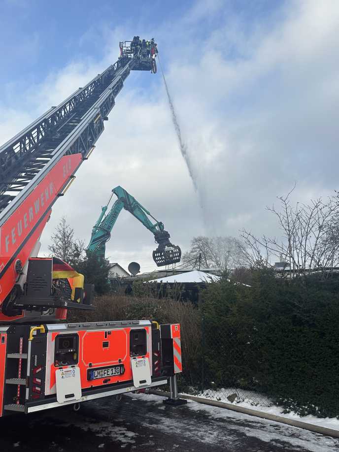 Um 09:41 Uhr wurde schließlich die Feuerwehr Elz mit der Drehleiter und dem zugeordneten Tanklöschfahrzeug hinzu alarmiert.