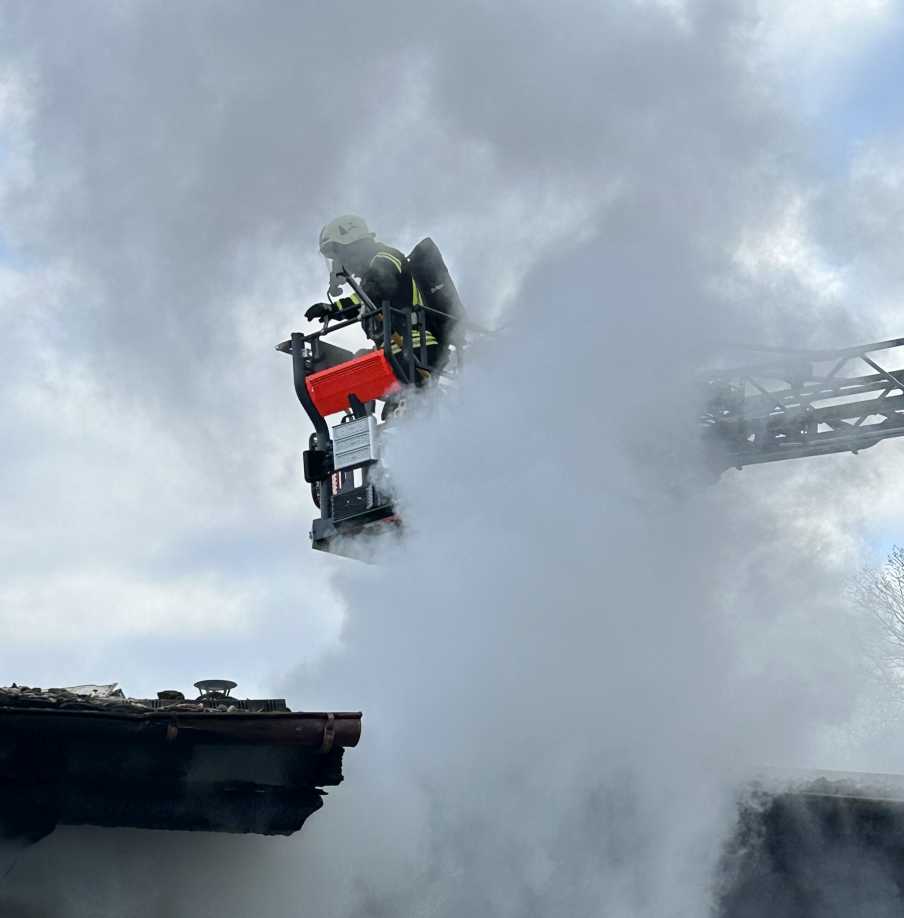 Schließlich musste ein Bagger Teile des Dachs öffnen, um das im Inneren schwelende Feuer komplett abzulöschen.
