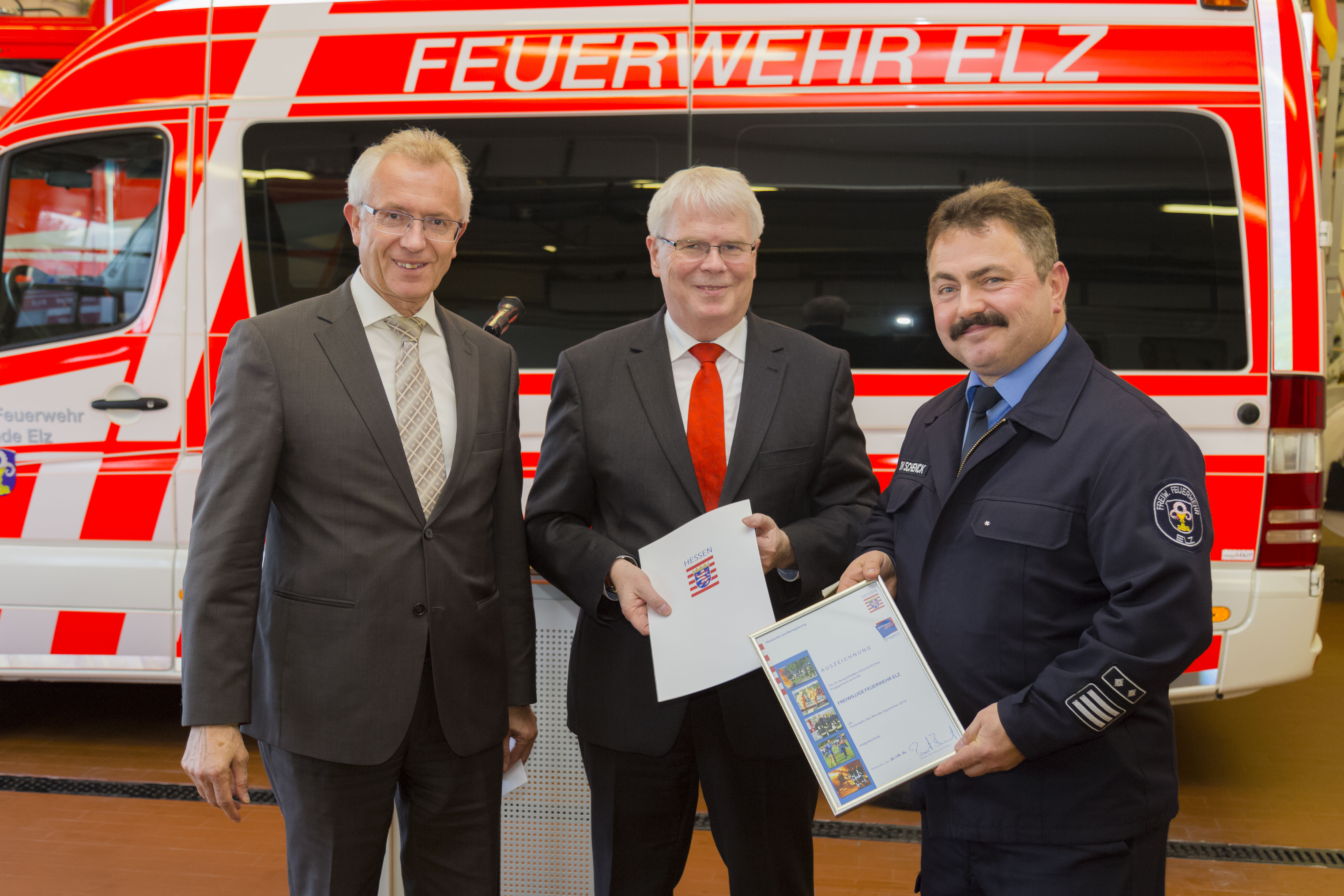 Staatssekretär Werner Koch (Bildmitte) überreichte die Auszeichnung "Feuerwehr des Monats" an den Elzer Bürgermeister Horst Kaiser (links im Bild) und Gemeindebrandinspektor und Wehrführer Hilmar von Schenck.